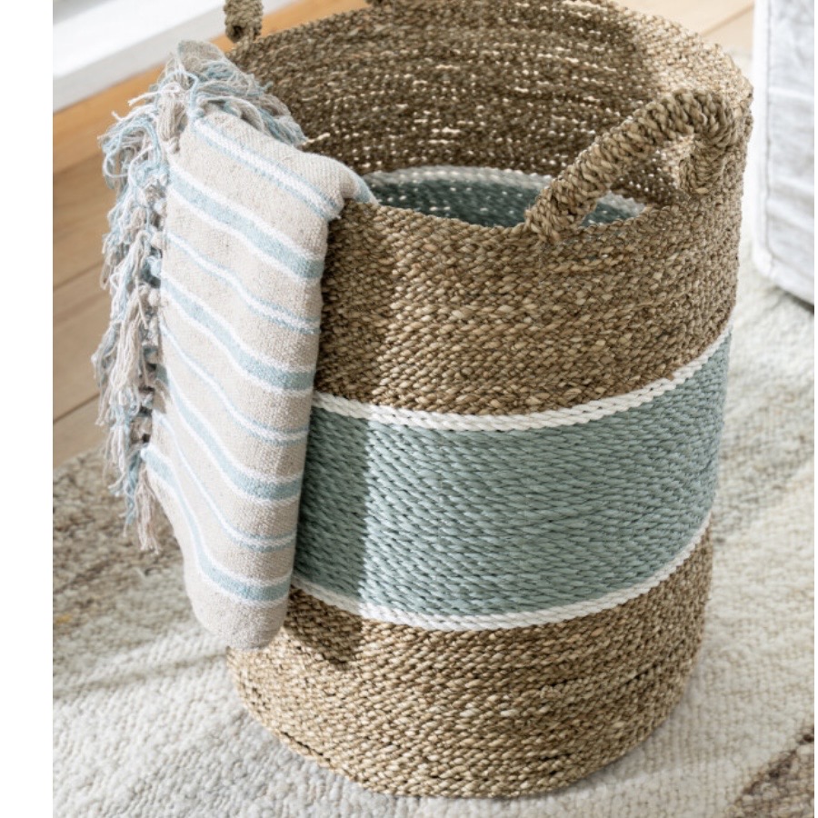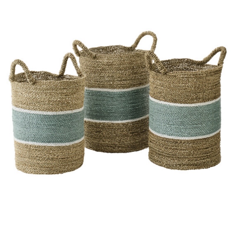Set de 3 paniers lignés jonc de mer naturel/turquoise 40xH57cm
